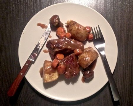 - After 1 hour, turn the meat over and add the potatoes, carrots, and mushrooms to the baking dish. Pour on the remaining sauce, cover, and return to the oven until the meat is fork-tender, about 1 more hour. Serve the short ribs, potatoes, carrots, and mushrooms with sauce drizzled over them!