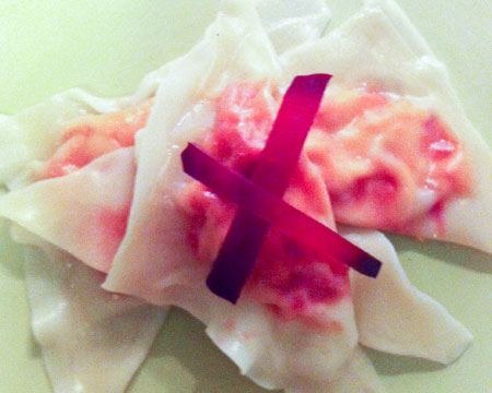 - On a large cutting board or work space, lay out the wonton wrappers and place about 1 tablespoon of the filling close to a corner of each wrapper. Wet the edges of the wrapper with some water and fold over to make a triangle. While filling the wonton wrappers, bring a large pot of salted water to a boil over high heat.