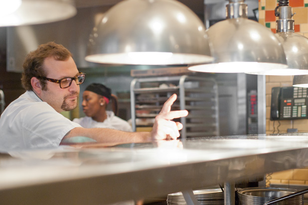 Line cook Alec Fatherree talks across the kitchen. While most of the conversation revolves around lunch service, it's not unusual for service to be peppered with sports talk: "Did you see that Missouri game last night?"