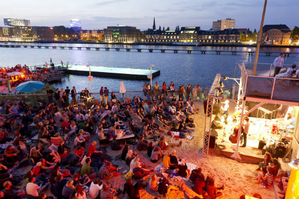Yes, the first bar on our list is in Berlin, a city that is notably not on the seaside. But Berliners have made this little strip of the Spree River into a beach, complete with sand, beach chairs, an open-air bar, and a pool that actually floats in the river. In the winter it remains open as a "wellness retreat," with the pool heated, and with two saunas. Oh, and they have table tennis. Well done, Berlin.