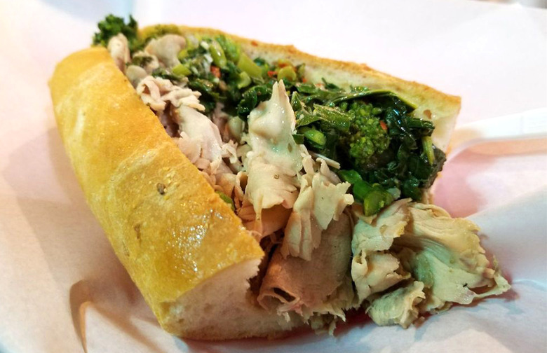 DiNic's, an always-bustling stand located inside the famed Reading Terminal Market, serves a handful of classic hot Italian sandwiches such as slow-roasted brisket of beef and Italian-style pulled pork. The must-order, however, is DiNic's roast pork sandwich. To make this beauty, a mound of juicy, thin-sliced, falling-apart pork is pulled from a tub of its own juices and added to thick slices of sharp aged provolone on a semolina roll then topped with slightly bitter, garlicky, tender, chopped broccoli rabe. The hot pork slightly melts the cheese below it, and the rabe ties it all together. One bite and you'll forget all about that other Philly sandwich.