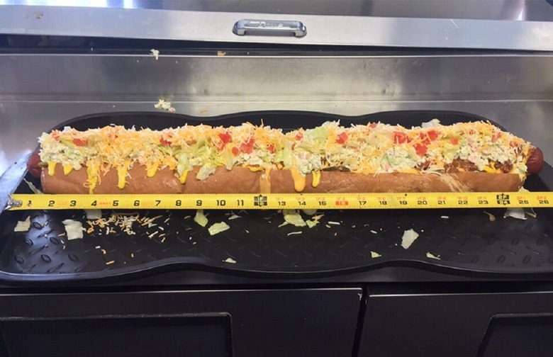 Hillbilly Hotdogs specializes in outrageous hot dogs, and the WidowMaker is its peak. The 30-inch hot dog holds a 2-pound sausage and has 4 pounds of toppings.