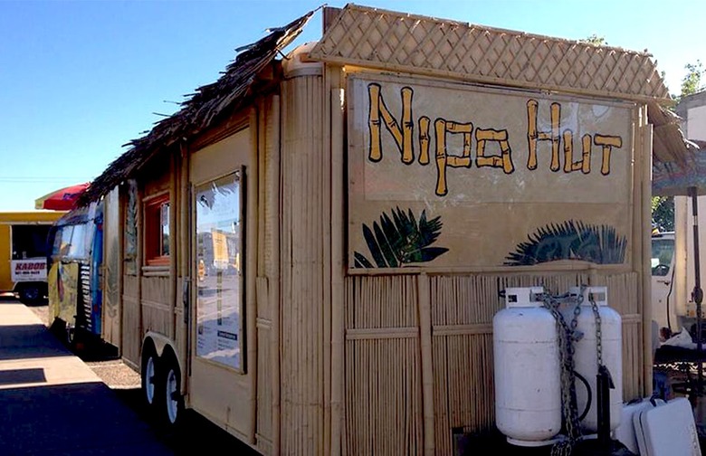 A nipa hut (also known as a "bahay kubo") is a little house found on the islands of the Philippines, so of course the Nipa Hut food truck looks like a little bamboo shack and serves Filipino food. Featured dishes include lumpia (beef or vegetarian with celery, carrots, garlic, onions, and cilantro), chicken or pork adobo (slow-cooked in sweet soy sauce, garlic, onions, ginger, and vinegar), empanadas, and sides of fried rice and pancit noodles.