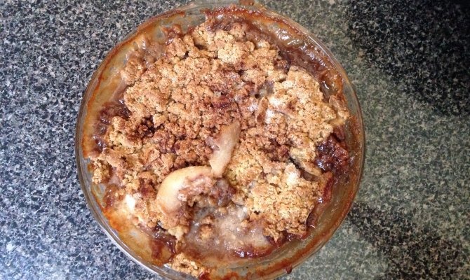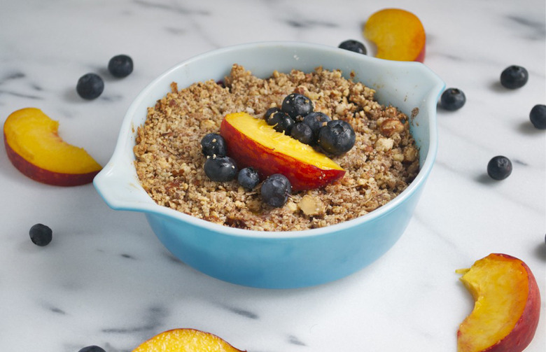 The contrast between the sweet and luscious filling and the crunchy topping is perfect. There is almost no added sugar to this crisp: The natural sugars of the fruit are just enough. But I did add a smidgen of honey to the nut topping to give it that bit of sweetness. For the Peach Blueberry Crisp for Two recipe, click here.