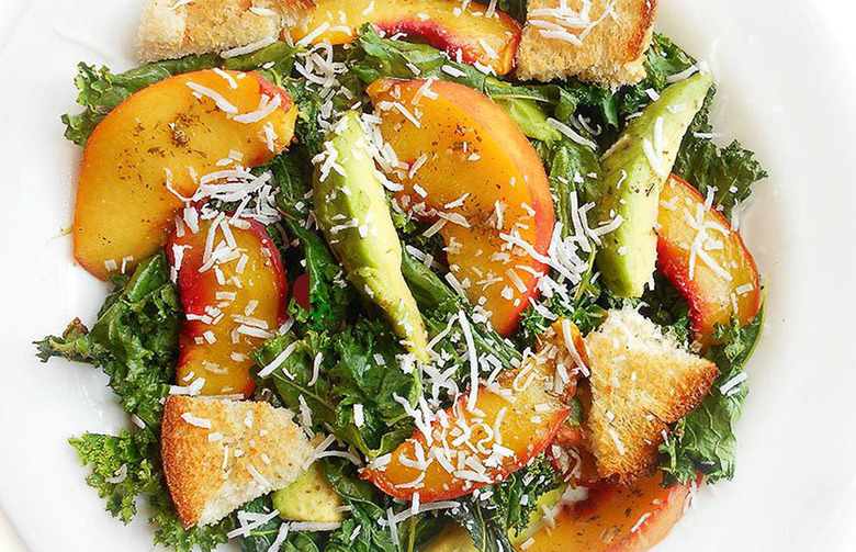Kale has a very strong flavor — at times, it's more bitter than tasty.ce On the other hand, peaches are perfectly sweet and juicy. When they come together, it's taste perfection. Peaches give sweetness to the kale, creating a delicious salad. For the Kale with Peaches and Coconut recipe, click here.