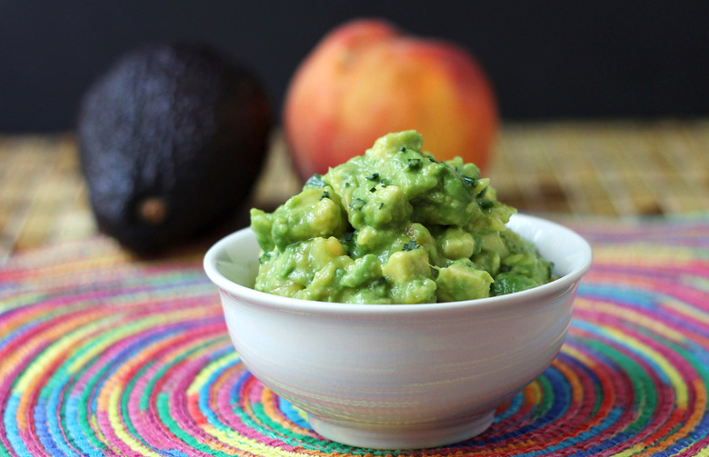 In this guacamole, peaches play role similar to tomatoes — a little sweet and a little tart, with a surprisingly similar texture. Give it a try — I think you'll like it. For the Whole Foods Feasting: Peachy Guacamole recipe, click here.