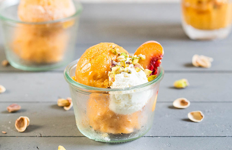 This sorbet is super easy to whip together (who loves ya, no-churn), yet elegant enough for a party, and it is my new favorite snack. Who doesn't want to snack in fancy pants style? The sorbet is silky, light, and misleadingly rich in texture. Poaching the peaches in bourbon adds a depth of mellow, boozy, bodacious flavor to the succulently sweet fruit. For the Bourbon Poached Peach Sorbet recipe, click here.