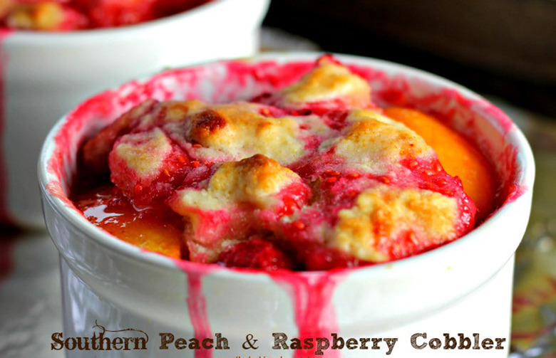 This simple cobbler has a tender, cake-like biscuit top and features juicy, plump raspberries and sweet peaches. For the Southern Peach Raspberry Cobbler for Two recipe, click here.