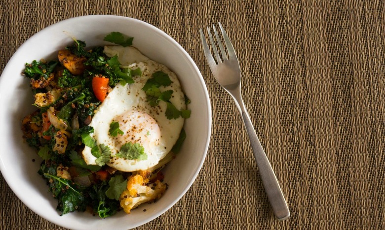 Start by roasting some sweet potato and cauliflower. Cook the quinoa while they're roasting. Later on you'll add chopped onion and red pepper as well as kale directly to your sauté pan. Experiment with your favorite vegetables or with what you might have on hand! Make enough roasted veggies for the week and you can enjoy this hash every morning! — Oat and Sesame