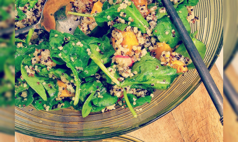 A hearty vegan salad with chunky nuggets of roast pumpkin, fresh spinach leaves, radish slices, and cooked quinoa. — Vie de la Vegan