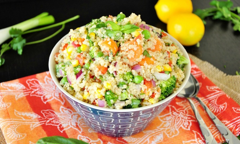 Try this healthy quinoa bowl filled with red onions, carrots, corn, broccoli, and spinach.