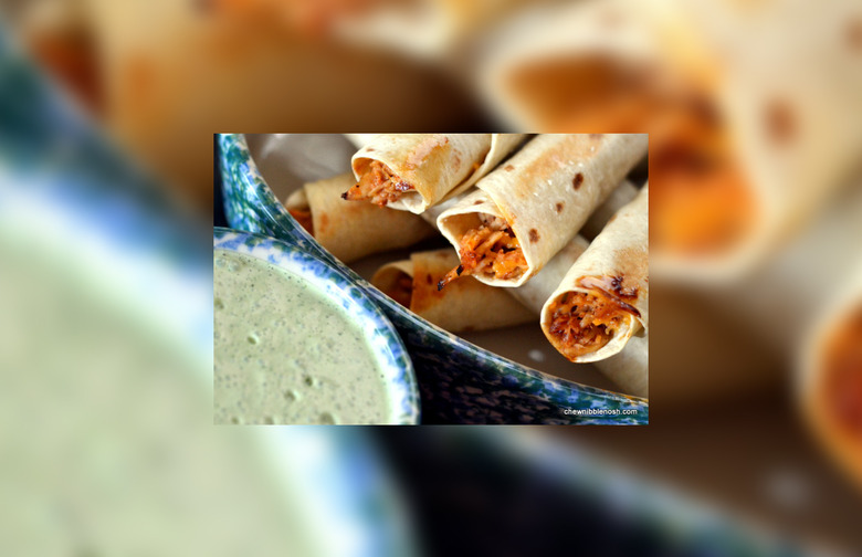 These little taquitos are so, so good. Slice them in half, or even thirds and you've got great finger food for a party. The chicken is tangy, sweet, and smoky, with just the right amount of spice. As the chicken bakes, the honey helps caramelize the edges of the taquito, which just adds to the great flavor. — Chew Nibble Nosh