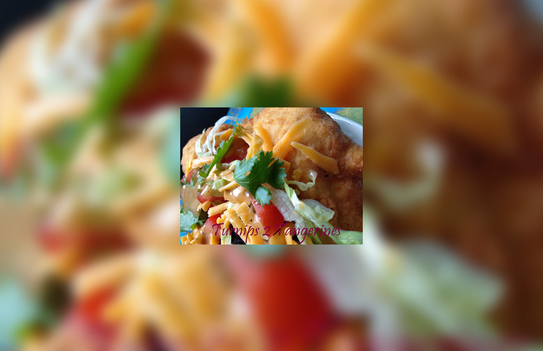 This recipe has all of your favorite components of a taco recipe — ground beef, cheese, tomatoes, red onion, jalapeños, and sour cream, piled high on an Indian fried bread.