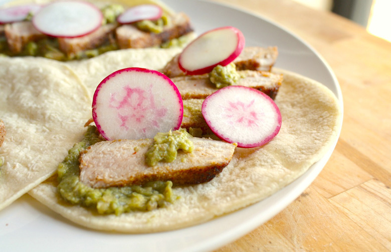 It's Tuesday, and that means you're probably thinking about tacos. (I think about them on all of the other days of the week too.) Here I make quick, easy tacos using beautifully sautéed pork chops as the main attraction. The pork is paired with an easy guacamole and sliced radishes, and is wrapped in corn tortillas (which are by nature also gluten-free). With just a few ingredients from the grocery store, you can be stuffing your face full of tacos in no time. — The Hungry Hutch
