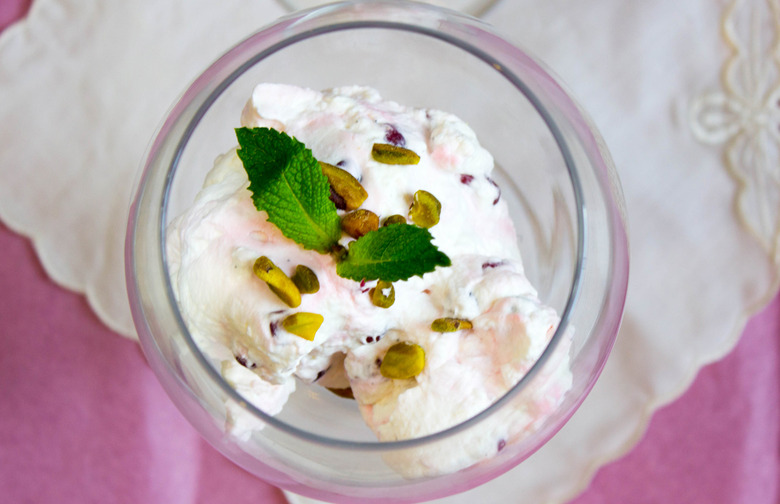 Sweet cream whipped and swirled with white chocolate, crunchy pistachios, and sweet pomegranate seeds.—The Hungary Buddha