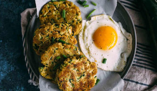 Though I love to cook, I'm always looking for ways to spend the least amount of time on lunch/dinner. These zucchini fritters fit that bill quite nicely. These babies are made with FOUR ingredients and go perfectly with a fried EB egg. Seriously, runny yolk+fritters are a perfect match! –Erin