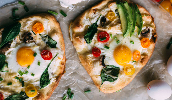 Ok, ok so we've been eating pretty healthy with salad and fritters, so now we're eating pizza. But not just any pizza: egg pizza! Oh, and let me tell you a secret: this pizza is actually pretty healthy, so the trick's on you! I used naan bread and topped it with cream cheese, vegetables and a fried EB egg–great for breakfast, lunch or dinner, really. -Erin