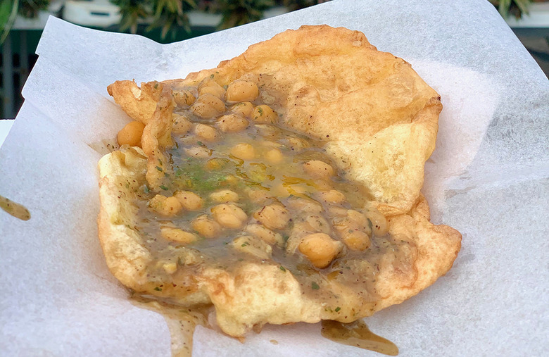 Doubles are a vegetarian street food from Trinidad that consists of two flat, palm-sized pieces of fried quick bread filled with a chickpea curry called channa.
