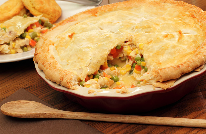 You can have a delicious pot pie on the table quickly and easily. A combination of cooked chicken, frozen veggies, and creamy herb and garlic soup is topped with biscuit crust and baked to golden perfection. Give it a try; this is comfort food that's sure to become a family favorite!