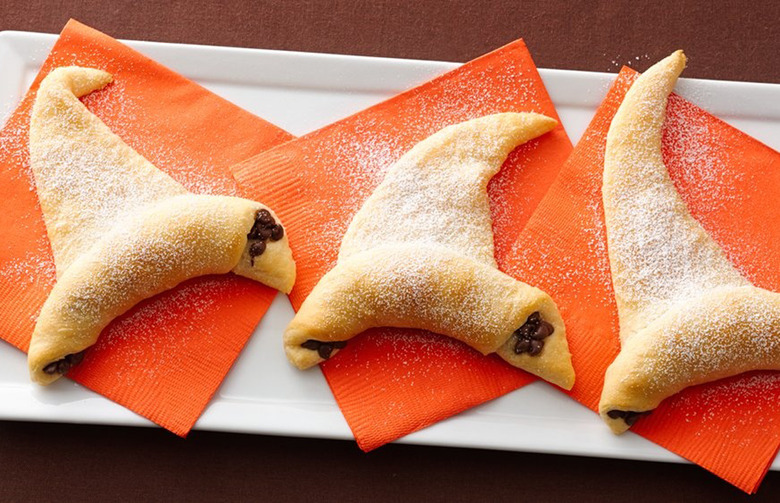 This is a simple and sweet treat that will impress your guests. Fill your store-bought crescent rolls with chocolate chips, shape them into witch hats, and bake. Cover them in powdered sugar and you have a dessert that everyone will love.