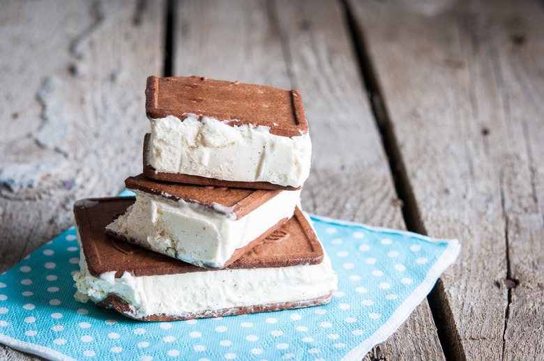 An ice cream sandwich is a quintessential summer dessert. When people are out and about enjoying the sunshine and warm weather, sitting in parks and under shady trees or floating in ocean waves at the beach, it is imperative that food be easy to hold and eat. Enter the ice cream sandwich! A wonderful creation with a cakey exterior that sticks to finger tips and a perfect layer of creamy ice cream in the middle. Commercially sold ice cream sandwiches tend to be the perfect size to quickly gobble down before rushing back to summer activities, without weighing you down.