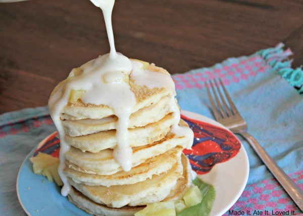 Pineapple Upside Down Pancakes will be your new favorite brunch treat. Pile the pancakes high, top with a spoonful of cinnamon butter and drizzle with vanilla syrup.