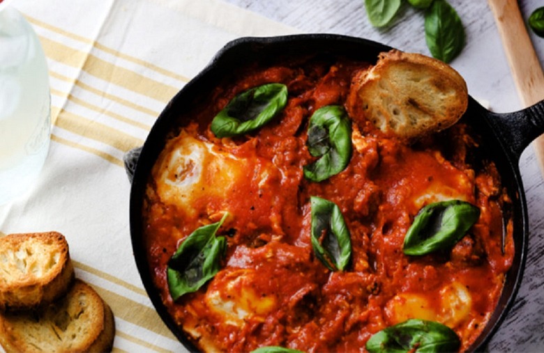 Marinara sauce is mixed with pepperjack cheese and basil then topped with runny eggs before being cooked to perfection. Recipe courtesy of Eggland's Best