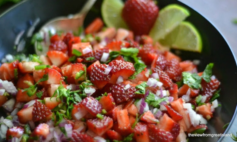 The strawberries are tossed with lime, cilantro, and finely minced red onion; it also has an added kick from jalapeños. It works perfectly and you can use it on fish, tacos, chicken, meats, or just scoop it up with chips. — The View from Great Island