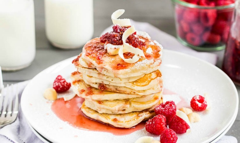 Macadamia Nut Pancakes with Raspberry Syrup and White Chocolate Shavings