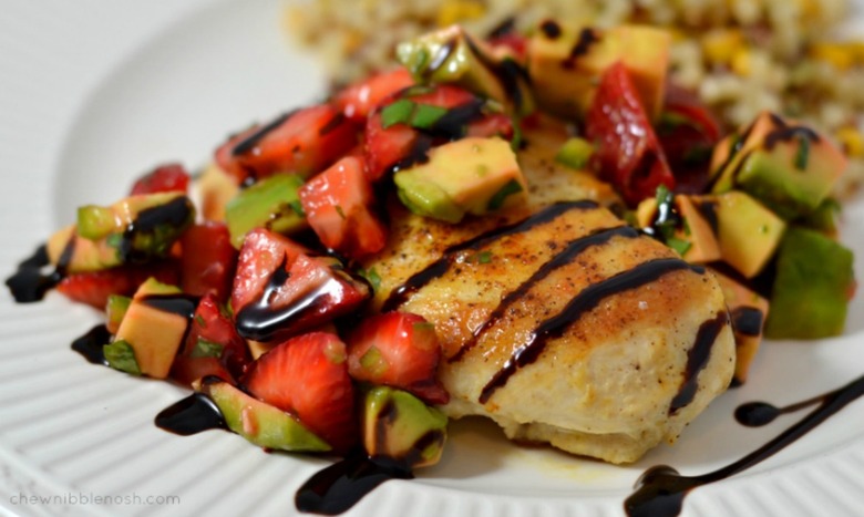 When it came time to serve up dinner, I simply spooned a hefty amount of the strawberries and avocado over the chicken, and then finished things off with a drizzle of balsamic glaze. — Chew Nibble Nosh