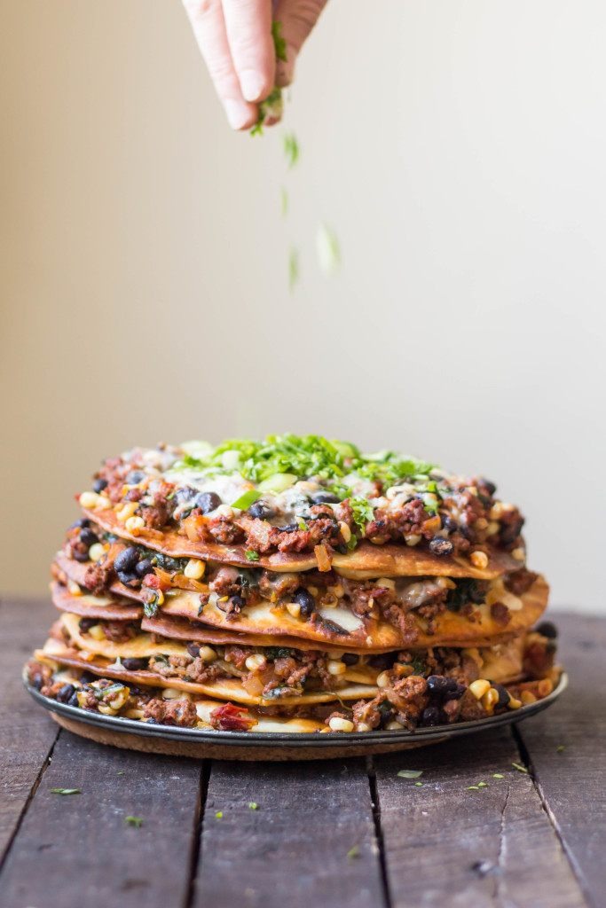 Instead of individual tacos, why not combine all the flavors into one big taco cake? Also known as Mexican lasagna, this recipe from Coley Cooks layers crispy tortillas with ground beef that is seasoned with chili and cumin and cooked with tomato, beans, corn, spinach, and cheese.