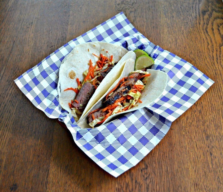 These tacos from Hezzi D's Books and Cooks are bright in flavor as well as on the plate. They feature the tastes of Thai cuisine with the sweet, sour, salty, and spicy flavors that are traditionally used. Coleslaw seasoned with ginger, sugar, rice vinegar, soy sauce, and chili paste is a great way to get maximum flavor into your tacos!