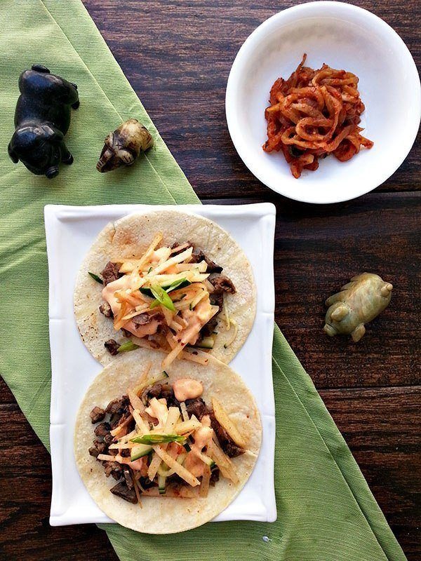 Inspired by Korean barbecue, these kalbi tacos from Cherry on My Sundae filled with kalbi (marinated short rib) as well as kimchi and a fiery gochujang aïoli. Though the marinade might seem like a lot of work, it is definitely worth it for these flavorful tacos.