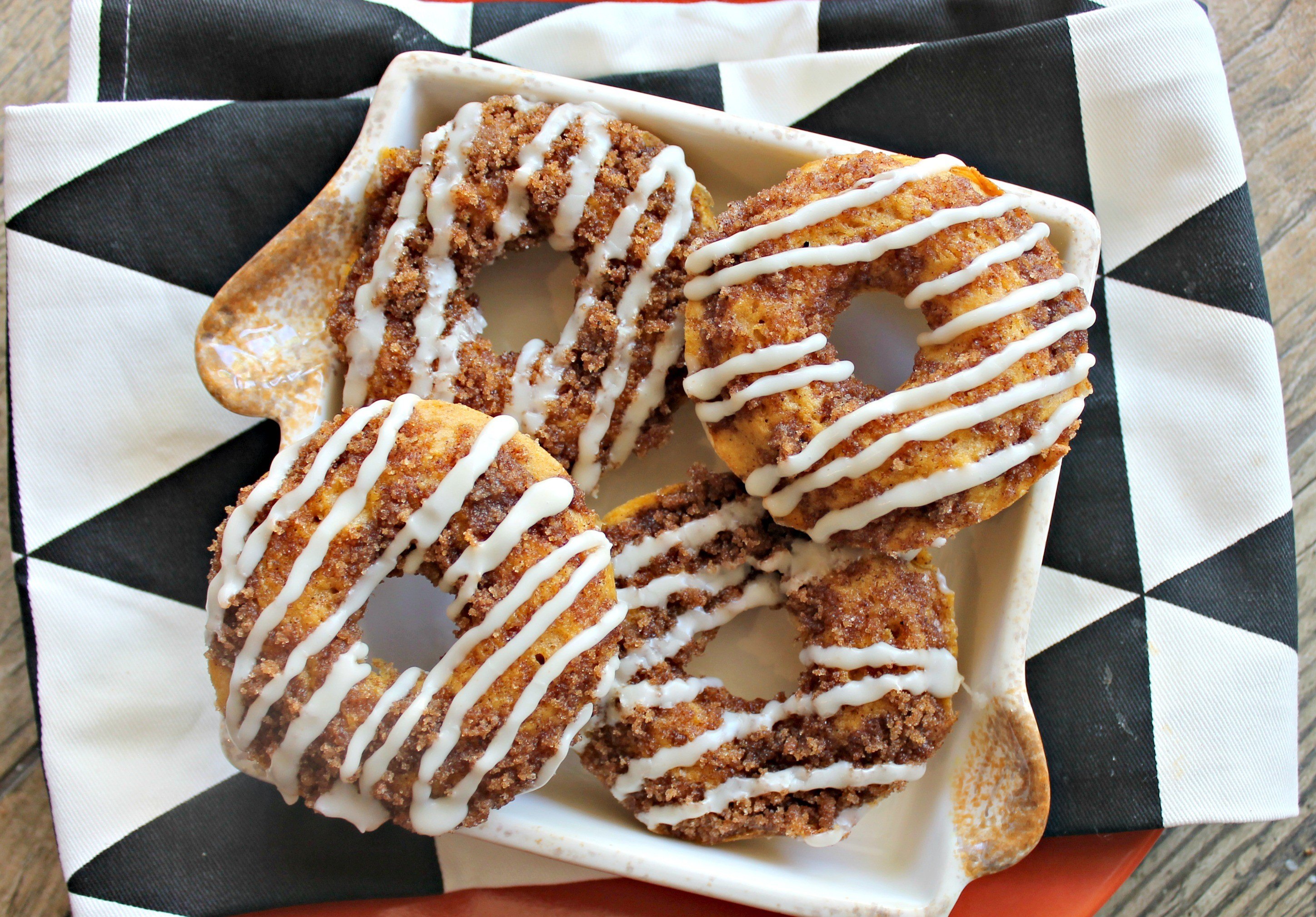 Forget donuts from the coffee shop. This homemade version takes only 15 minutes and can be enjoyed fresh from the oven, made using Krusteaz Cinnamon Swirl Crumb Cake and Muffin Mix and pumpkin puree for baked perfection in no time. Top with a simple brown butter frosting to put these over the top.