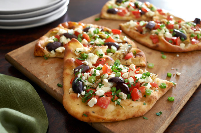 A colorful medley of roasted red peppers, Kalamata olives, and artichokes is a perfect complement to the bright flavors of tzatziki sauce and feta cheese. Added bonus? This delicious pizza is really easy to make.