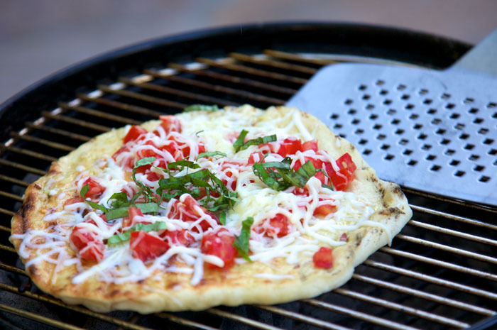 An outdoor grill is a great way to cook pizza; the crust gets a delicious char, similar to that of pizza cooked in a wood-burning oven. This recipe tops the grilled dough with tomatoes and mozzarella, but you could use fresh spring produce instead.