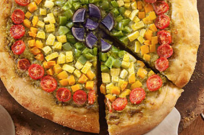 This colorful pesto-topped pizza is perfect for just about any spring produce. Top it with colorful peppers, blanched asparagus, and purple potatoes for a meal that's as good to look at as it is good for you!