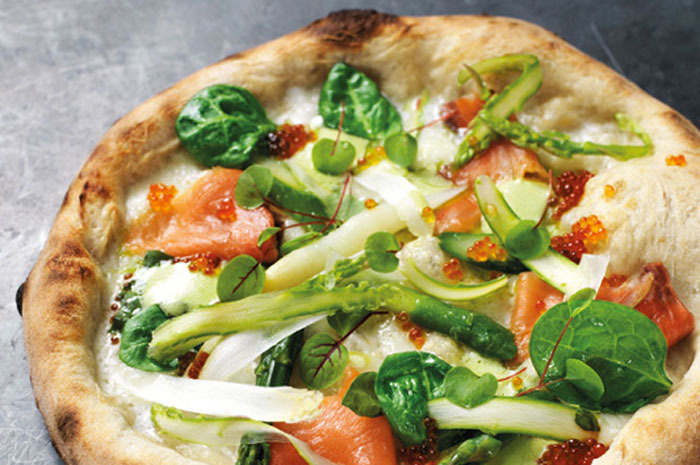 This pizza is so good you might want to make a double batch. It's topped with thinly sliced smoked salmon and fresh spring produce like asparagus and baby greens, making it the perfect light and wholesome meal.