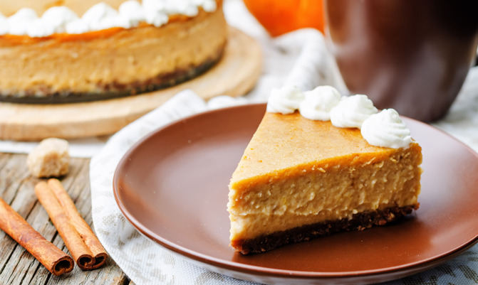 This recipe adds a pumpkin twist to traditional cheesecake — the pumpkin purée and Greek yogurt add creamy texture and tart taste.
