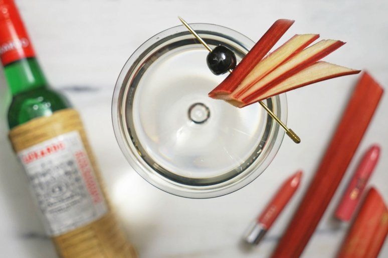 Rhubarb simple syrup and a maraschino cherry make this strong drink fruity and sweet. This drink, served ice cold, is perfect for the warmer months.