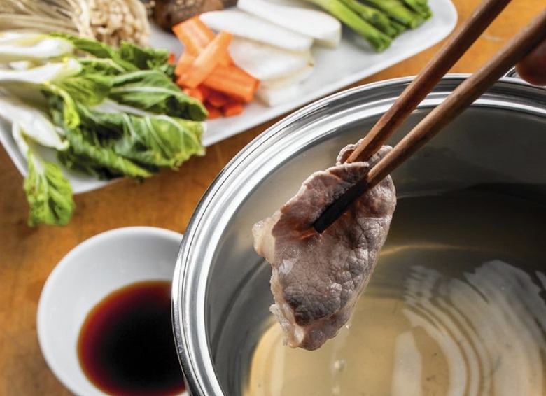 Shabu-shabu (named for the swishing sound the meat makes as it moves through the cooking liquid) is easy to do at home; you'll need a way to keep the broth superhot at the table. You can use an electric burner and a saucepan. A fondue pot will work too, simply start by heating the broth to a simmer on the stove and then transferring it to the fondue pot. If necessary, reheat the broth on the stove so it is piping hot.This recipe is by JeanMarie Brownson and was originally published in the Chicago Tribune.