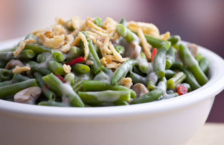 To prepare your green bean casserole ahead of time, mix together cream of mushroom soup, green beans, breadcrumbs, and onion, and leave in the fridge for up to three days before your dinner. When you are prepping the rest of your sides, take the mixture out of the fridge and put in a 350 degree F oven for about 30 minutes. Top with more onions and cook for another 10 minutes.