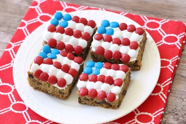 These Patriotic Cookie Bars allow each guest to have their own American flag! Don't have time to place all of the chocolate candies day of? Prep these cookies the night before and store them in an airtight container.