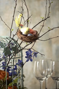 For the buffet table, place a fresh flower arrangement inside of a bird cage with birch branches "growing" through the cage where a motherly little bird built her nest of straw (at top)!