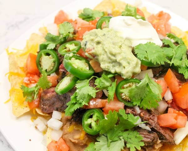 - Spread a layer of refried beans on top of the chips. Cover with half of the meat and half of the cheese. Sprinkle in half of the diced onion, tomato, and jalapeño. Repeat with the remaining ingredients. Cover baking dish with foil and bake for 10-12 minutes until heated through and cheese is melted. Remove the foil and top with guacamole, sour cream, and cilantro.