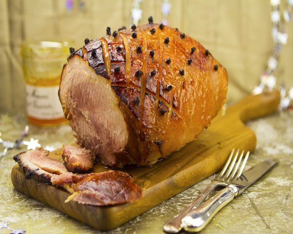 - Preheat the oven to 200 degrees. Completely line a roasting pan with heavy-duty foil. Drain the ham and set it in the pan. Uniformly stick the cloves in the ham. Pour the honey and the orange juice all over pork.