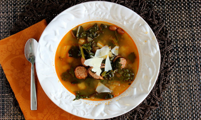 - Add the beans, chorizo, kale and the broth and bring to a boil. Once at the boil, cover the pot, reduce the heat and let simmer about 20 minutes, or until the potato and turnip are tender.