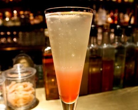- Shake and strain into flute; top with champagne and pomegranate juice. Float 3 Pom seeds for garnish dropped in bottom of flute.