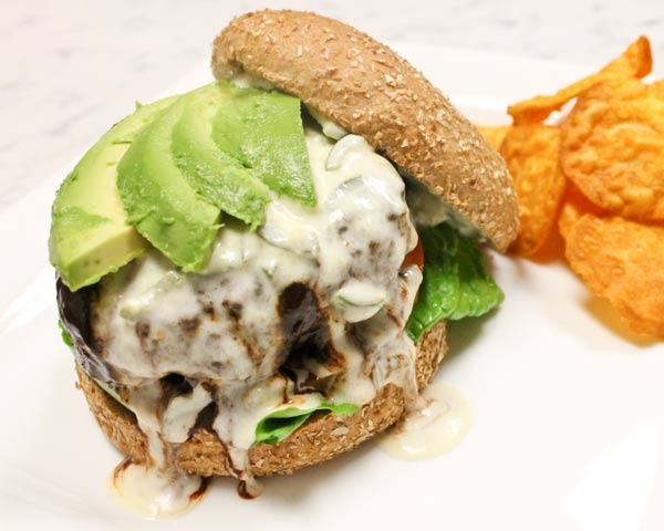 Mole Jalapeño Burgers: A six-ounce beef patty, served with lettuce, tomato, and onions, and topped with mole sauce, sliced avocado, sesame seeds, and jalapeño-cheese reduction, served on a whole wheat bun.