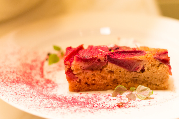 The grand finale was a plum upside-down cake that was reminiscent of a traditional holiday cake but with a modern and glamorous twist thanks to a dusting of pink confectioner's sugar. Marchand's dessert was served with carménère, a red wine from Chile; the grape variety was originally planted in the Bordeaux's Médoc region, but is now rarely found in France.